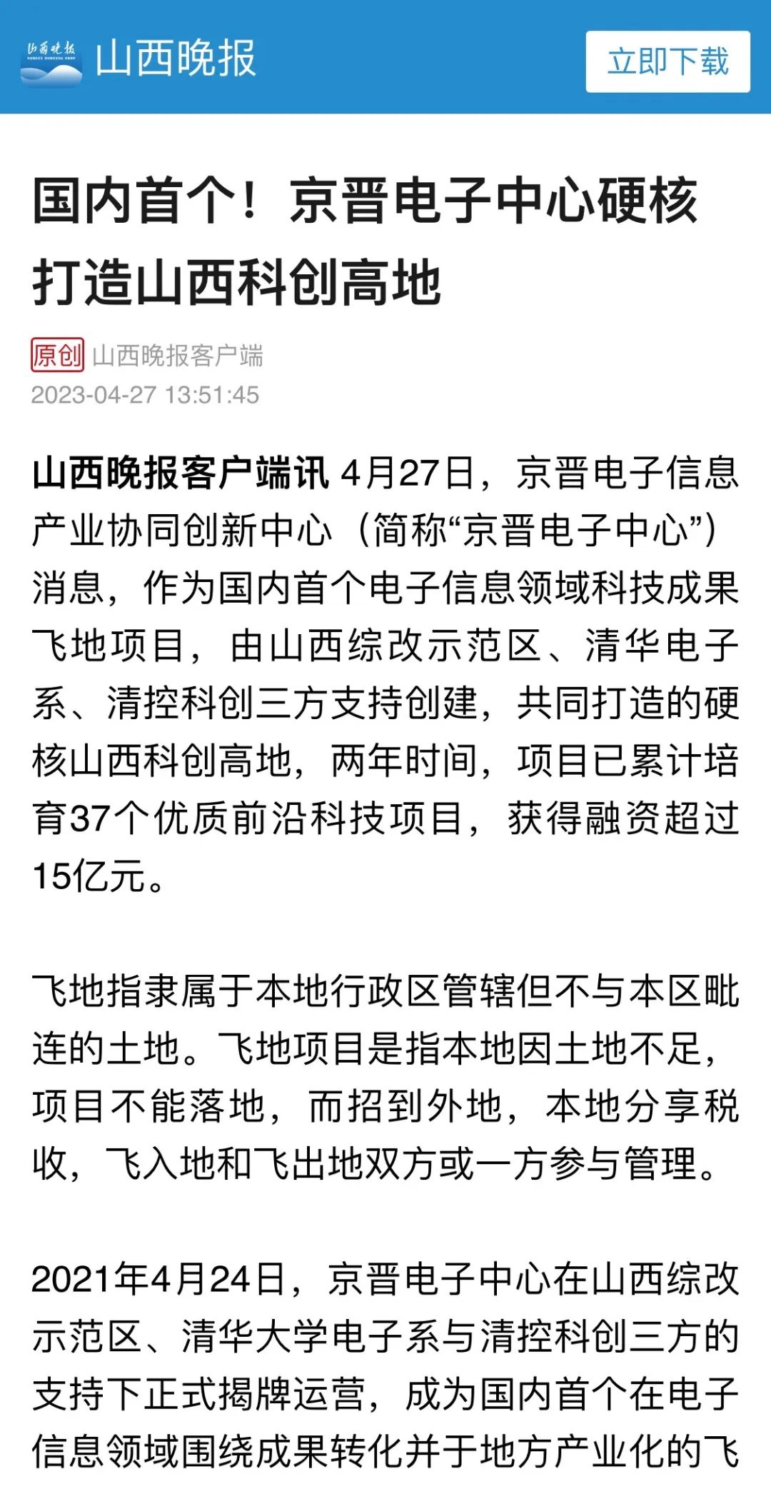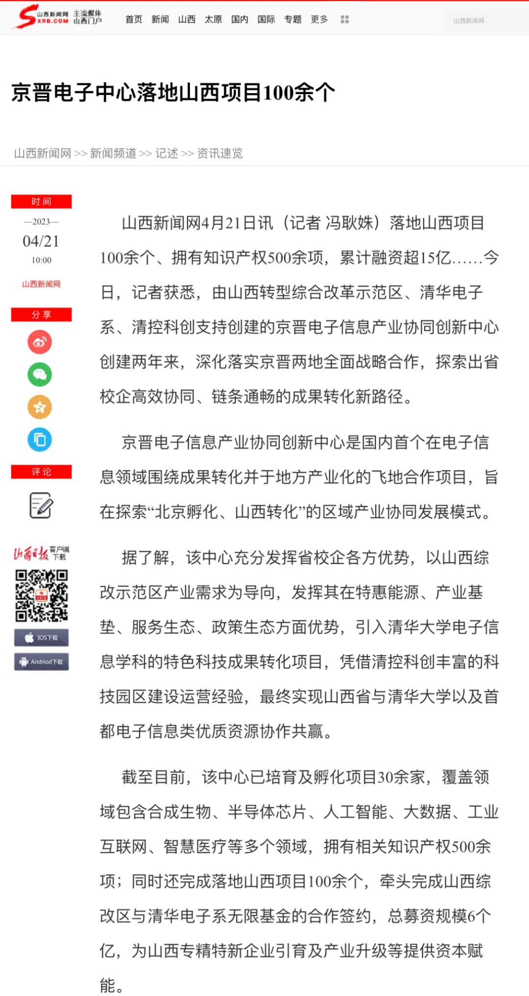 (以下摘选部分媒体报道) 山西新闻网 京晋电子中心落地山西项目100余个 山西晚报 国内首个!京晋电子中心硬核打造山西科创高地